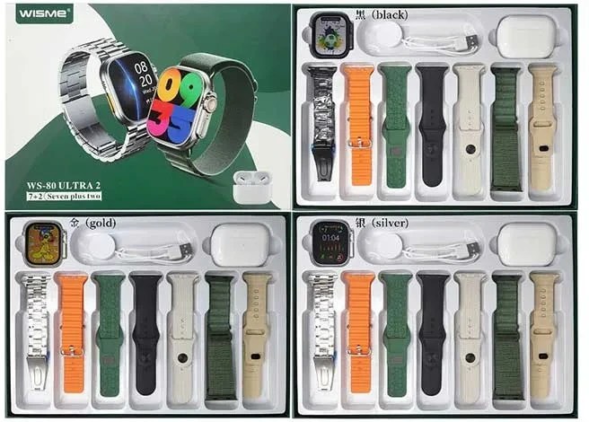 یک عدد ساعت هوشمند WS-80 ultra2، یک عددایرپاد پرو، 6 بند پارچه ای و سیلیکونی و 1بند فلزی،1عدد سیم شارژ وایرلس ساعت هوشمند و 1عدد سیم شارژ ایرپاد پرو